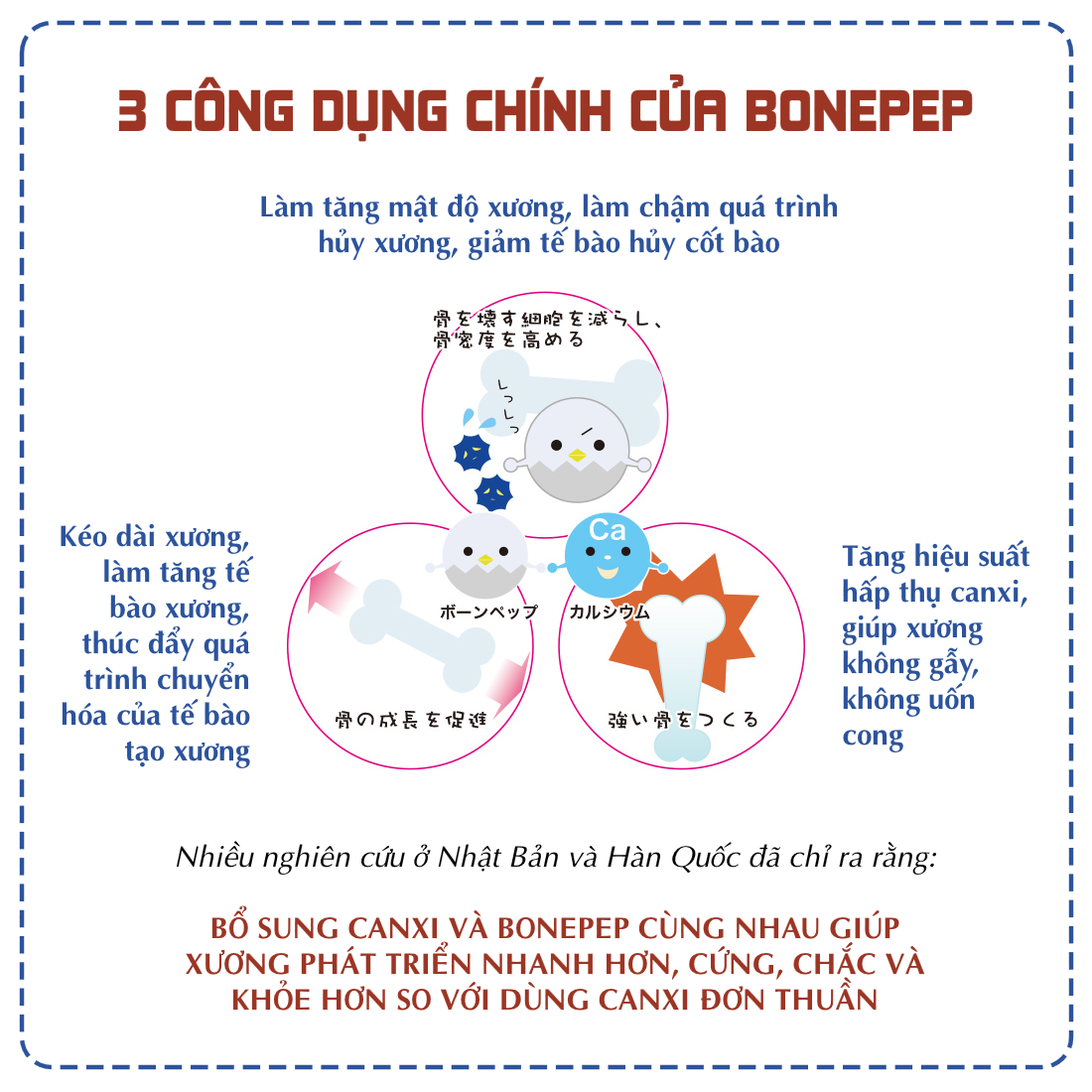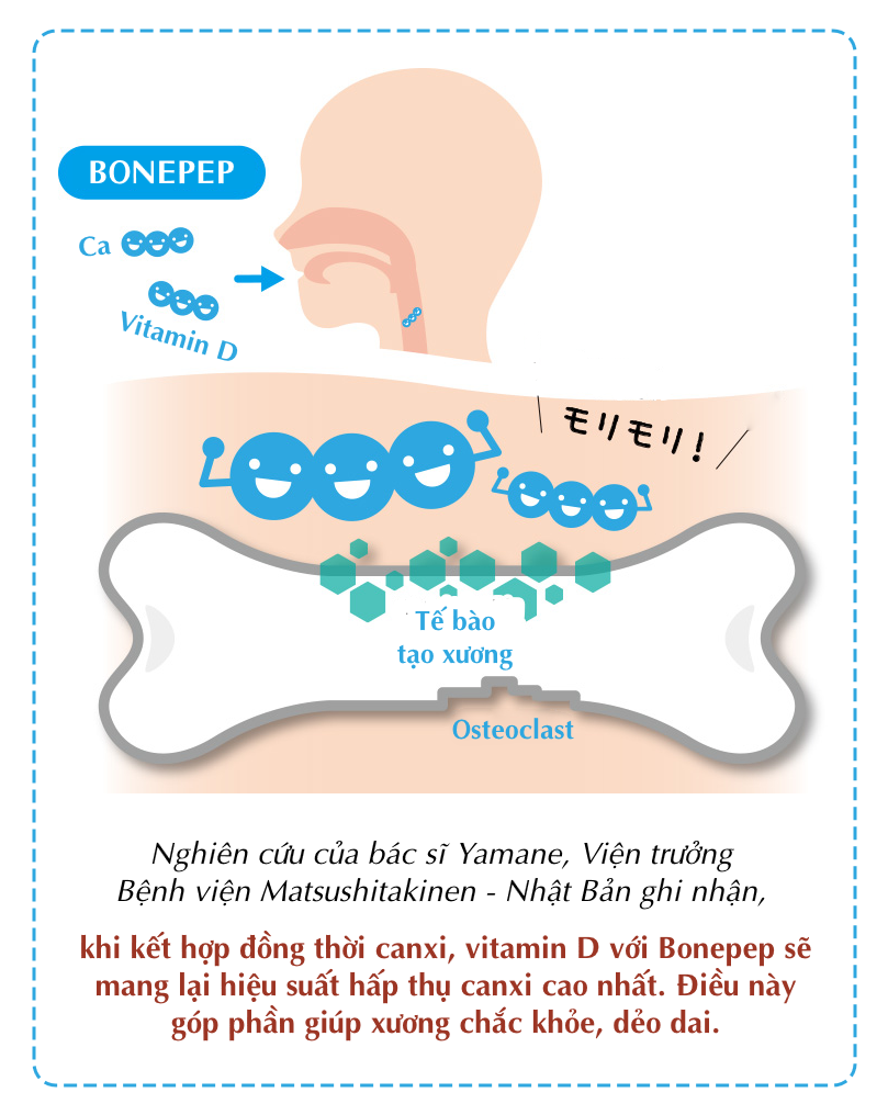 • Theo bác sĩ Yamane, Viện trưởng Bệnh viện Matsushitakinen - Nhật Bản cũng ghi nhận, khi kết hợp đồng thời canxi, vitamin D và Bonepep sẽ mang lại hiệu suất hấp thụ canxi cao nhất. Điều này góp phần giúp xương chắc khỏe, dẻo dai.